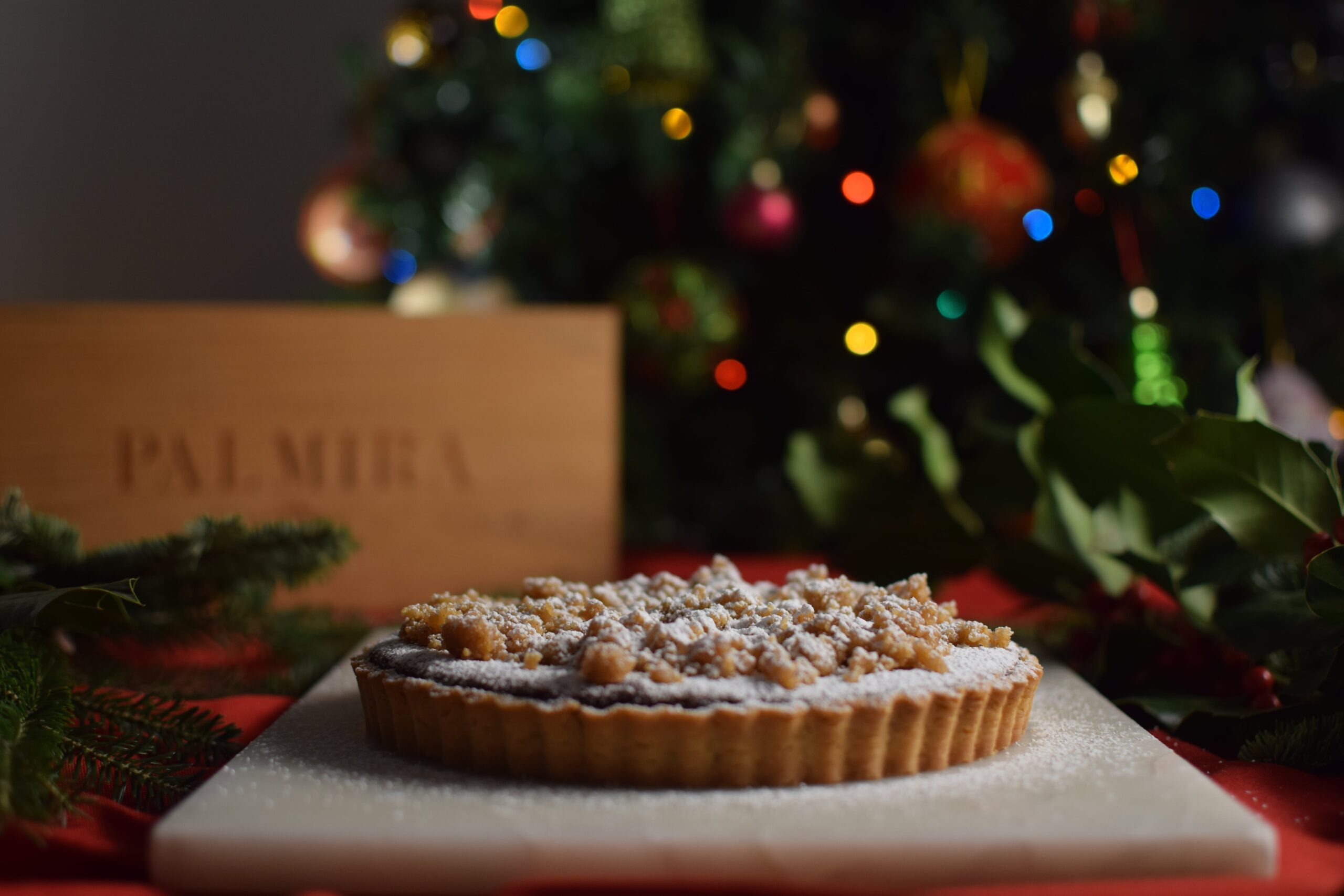 - Γεμίζουμε την προψημένη τάρτα με το μείγμα της γέμισης και κομματάκια από το μελομακάρονο.